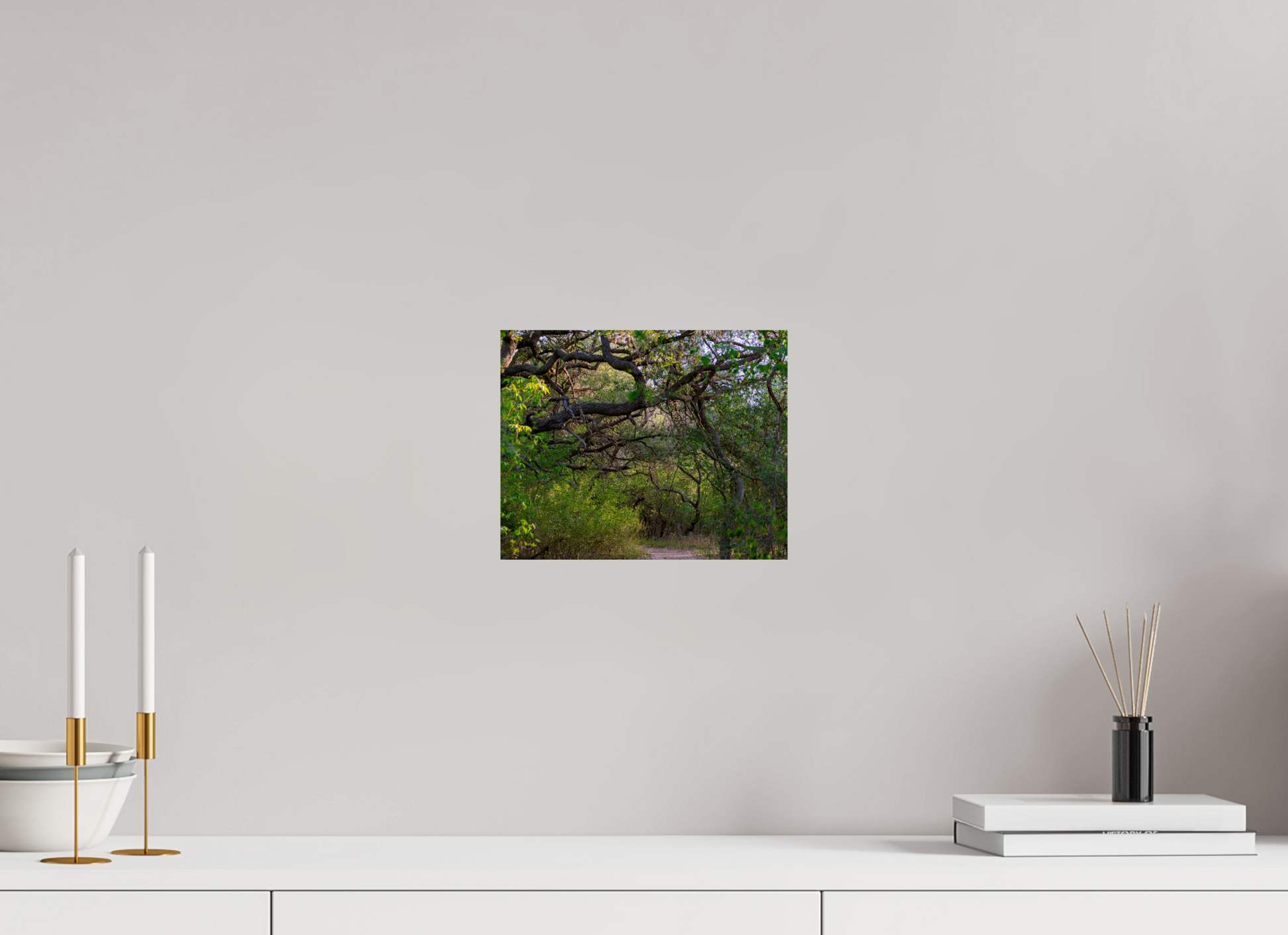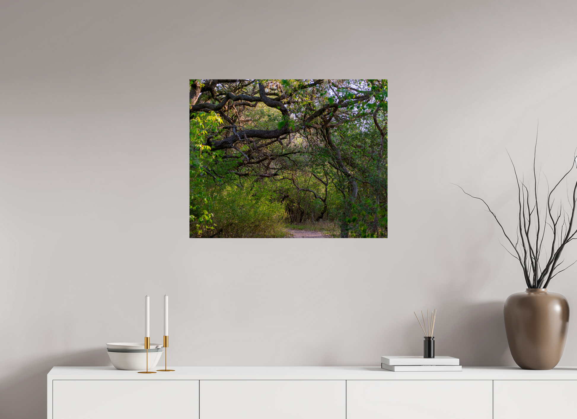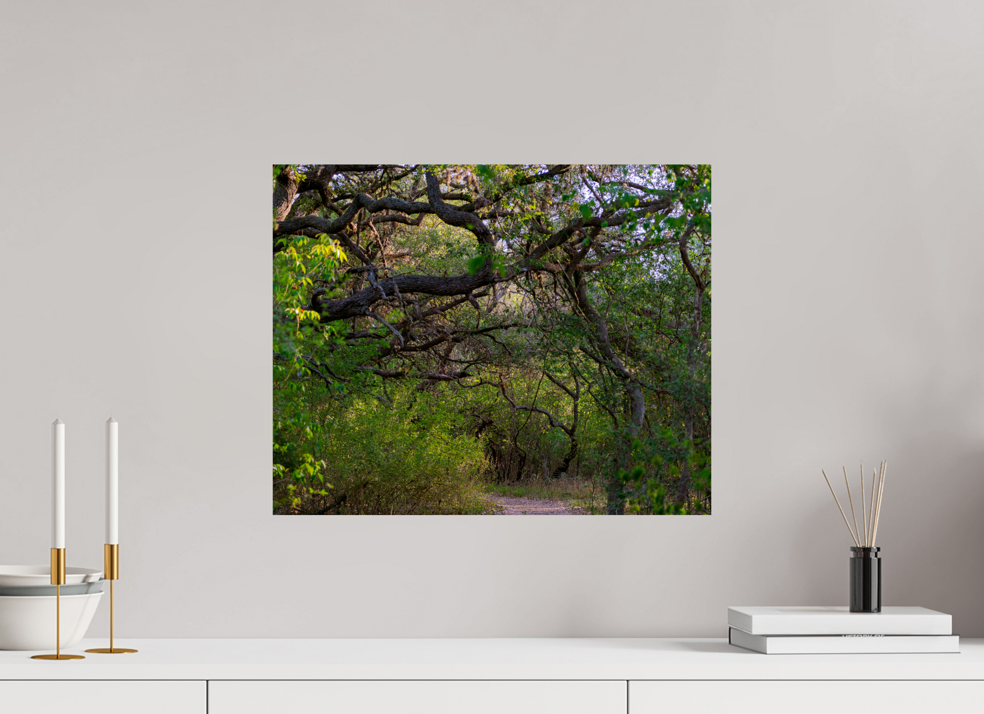 Dappled sunlight filters gently through the canopy of towering oaks and cypress trees, casting soft, shifting patterns on the earthy trail below. The path, framed by lush greenery, twists just out of view, hinting at unseen destinations and hidden wonders beyond the bend. The stillness is broken only by the rustling of leaves in the breeze and the occasional chirp of birds overhead.
